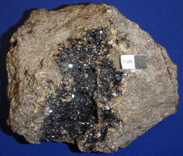 Photo Sp4, Sphalerite crystals in a matrix of small sphalerite crystals that resembles sandstone. Collected at the Annabel Lee mine, September 1988.